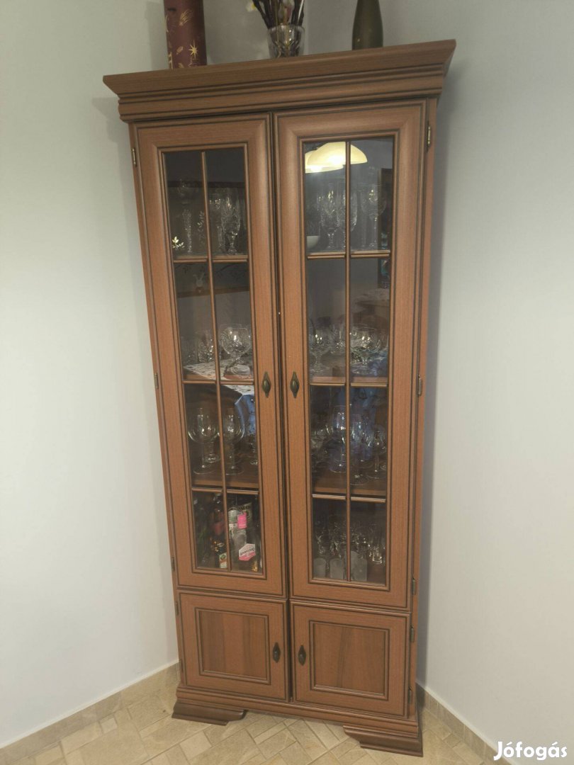 Eladó dió színű sarok tálaló szekrény.Méretei: 78 cm széles,198 cm magas a díszléccel,a legmélyebb mélysége 42 cm.Szép állapotban,tartalma nélkül eladó.Személyes átvétellel, szállításban nem tudok segíteni.A terméket máshol is hirdetem.