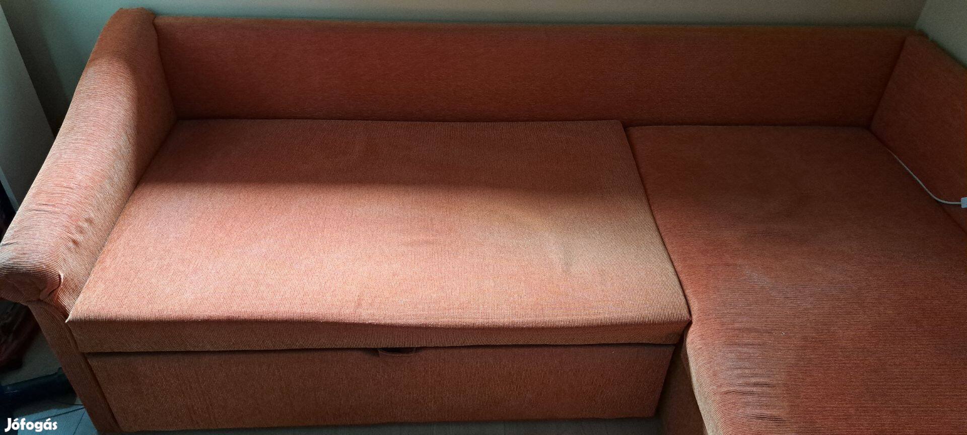 Eladó a képeken látható sarokülő, kihúzható ággyá alakítható, ágyneműtartóval. Az egyik párnán a díszgombok leestek, de meg vannak.