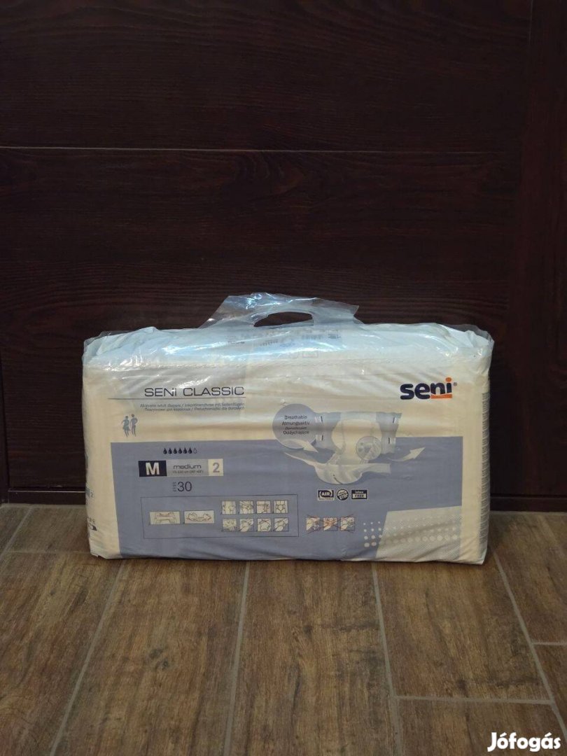 Felnőtt pelenkák Seni Classic M (6 csepp). 1 csomag 30 darab Csomag fel volt bontva, de mind a 30 darab megvan, ezért bónusz: + 1 db Seni Classic M és 1 db Seni Soft Super alátét 60x90cm).