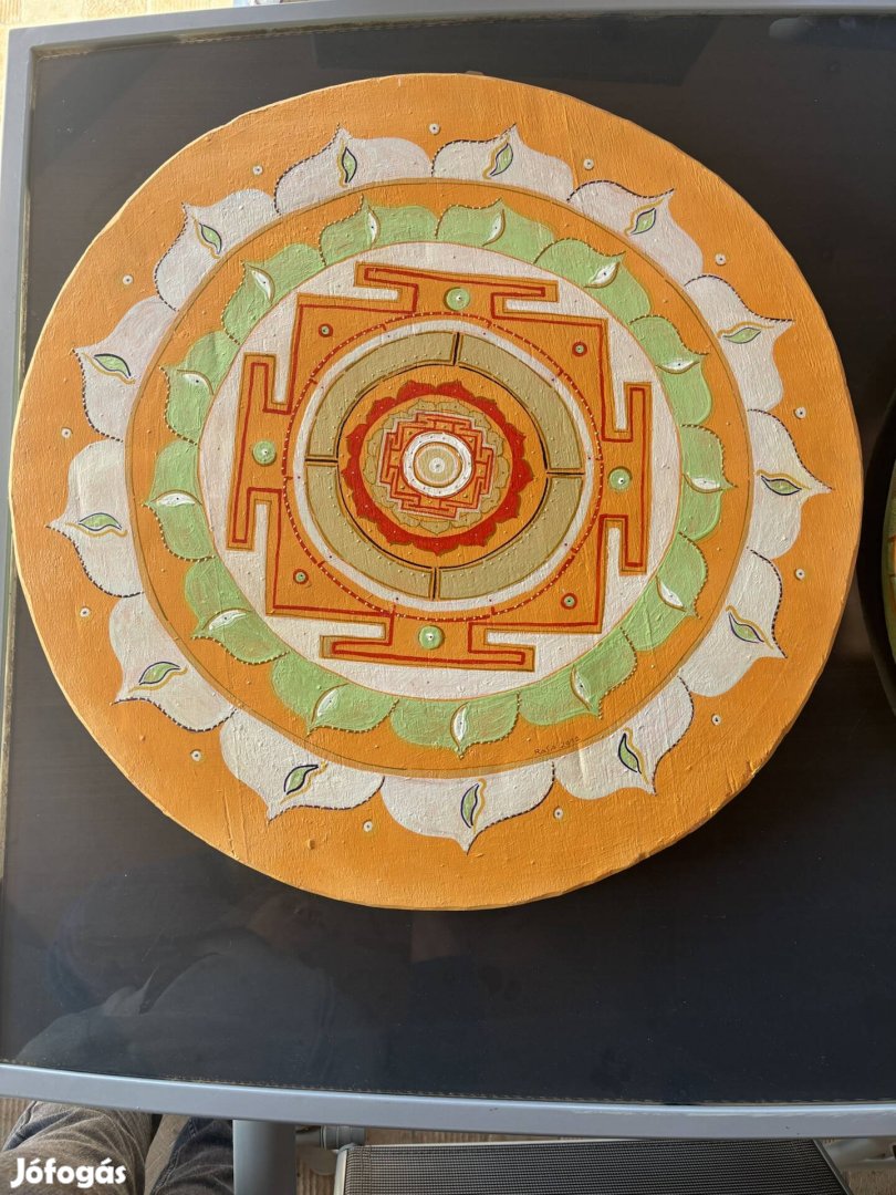Ez a 60 cm átmérőjű alkotás egy Shri Yantra mandalát ábrázol, amely a hindu és buddhista hagyományok egyik legerőteljesebb spirituális szimbóluma.