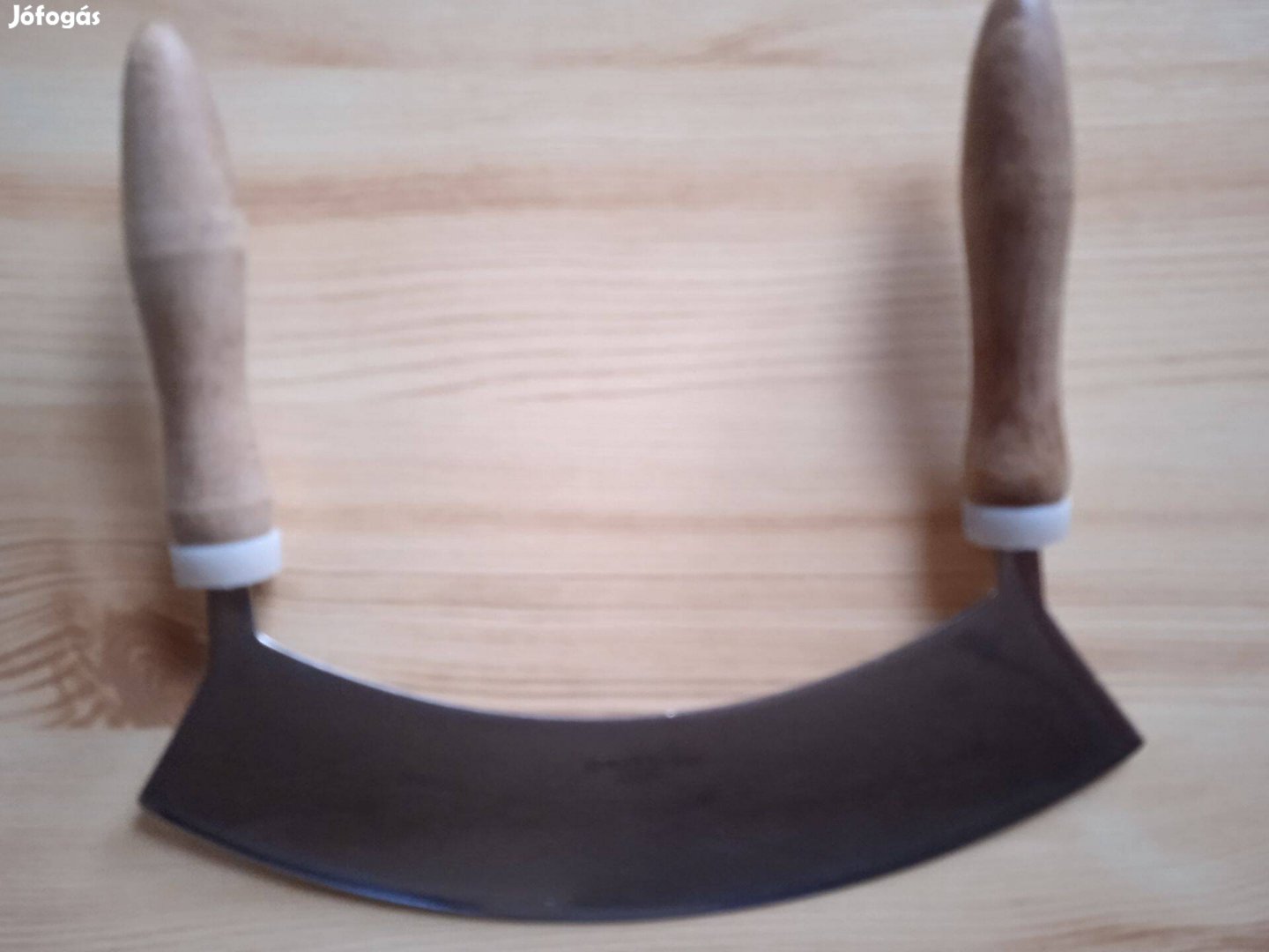 Eladó a fotón lévő használt aprítókés. A két nyél közötti távolság:14, 5cm, élszélesség:4, 5cm. Az egyik nyél picit repedt./fotó/