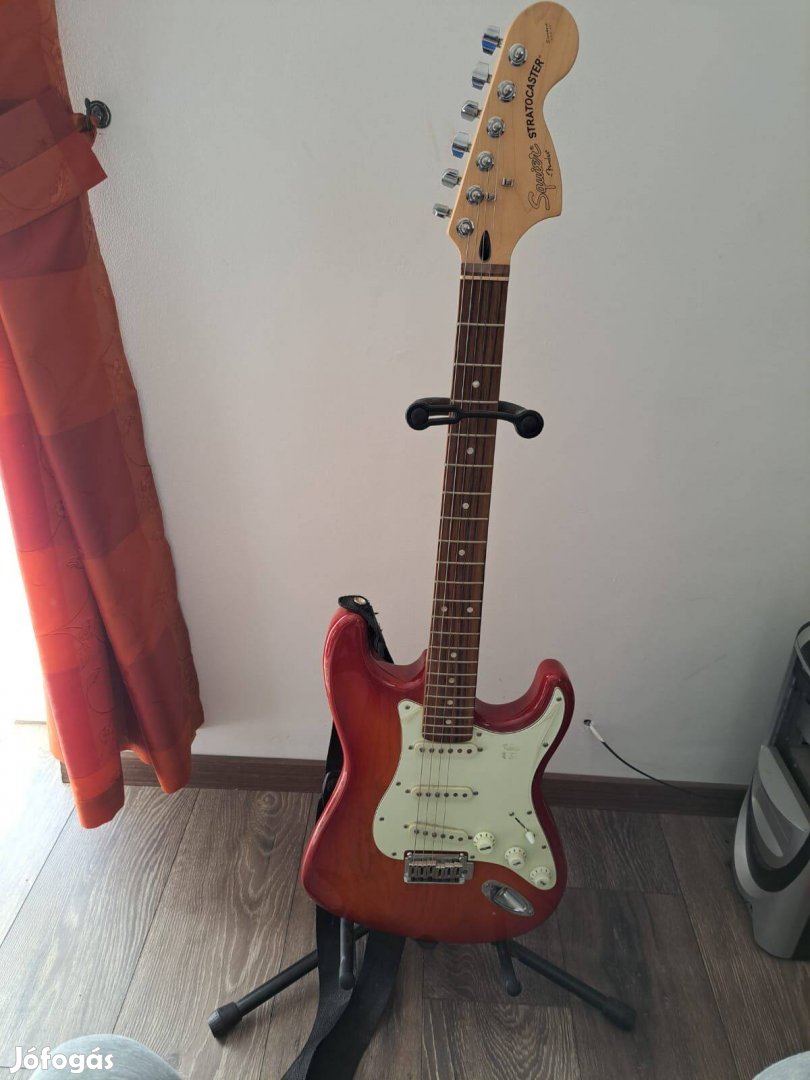 A gitár jó állapotban van, használ. a modell Squier, és Kínában gyártották. Ez egy gyönyörű gitár, vörös testszínnel, és nagyszerűen kiegészíti bármely zenész gyűjteményét.