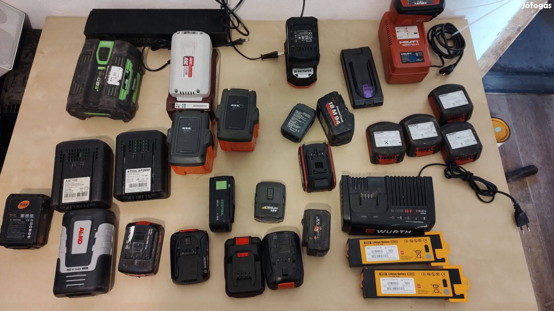 Stihl,Husqvarna,Viking,Alko,Hilti,Bosch(29db)akku,töltő vegyes csomag