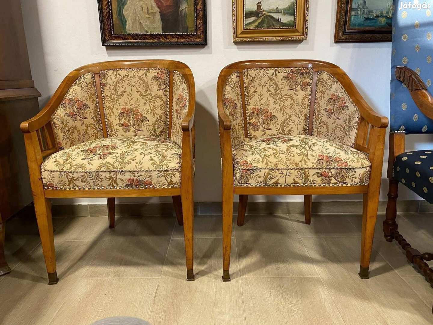 Szerkezetileg stabil, szép állapotú karfás székek ülőmagassága 50 cm, ülőszélessége 46 cm, ülőmélysége 44 cm, támlás magassága 80 cm. Az ár darabra értendő.