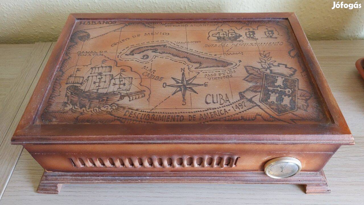Eladó a képeken látható használt, jó állapotú, Kubából származó eredeti kézműves, mintázott bőrrel díszített és bevont humidor, szivartartó kb. 40 szál szivarhoz. Spanyol cédrusból készült, kivehető szivartartó rekesz és külön fedeles kis párásítótartó rekesz. A humidorhoz jár az eredeti szivacsos párásítója, illetve külön digitális páratartalom-mérő, mert az eredeti páramérője már nem működik (cserélhető egy másik, megfelelő méretűre) Humidor mérete: 38 x 25 x 12 cm A hamutartó 20x20 cm és 1 kg. Ilyet már aligha lehet szerezni, vagy hozni. Átvétel: Szigetszentmiklóson személyesen, vagy esetenként Campona környékén, illetve a XXI. kerületben. Csere nem érdekel. Humidor 60 eFt, hamutál 10 eFt