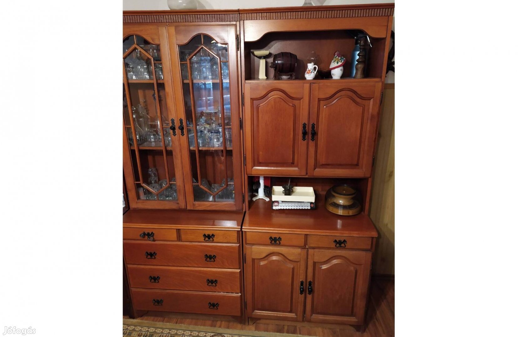 Cseresznyeszínű 2 db tálalószekrény eladó tömör fából. Megkímélt állapotúak. Az egyik fiók fogantyúja hiányos. Méretek: szélesség: 75 cm, mélység:49 cm, magasság: 191 cm,. Ára: 40000 Ft/db. A tálaló szekrények a fiókok fölött szétszedhetőek a könnyebb szállítás érdekében. Étkező asztal is van a szetthez. Másik hírdetésemben megtekinthető.