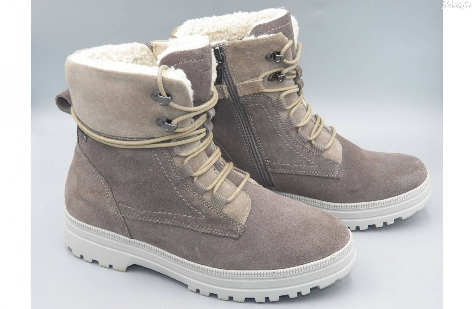 Újszerű állapotú Tamaris Duo-texes (víztaszító) velúrbőr bakancs. Bélése bundás (saját talpbetétje helyett egy bőr Hotter talpbetét van benne). Cipáros-fűzős fazonú.