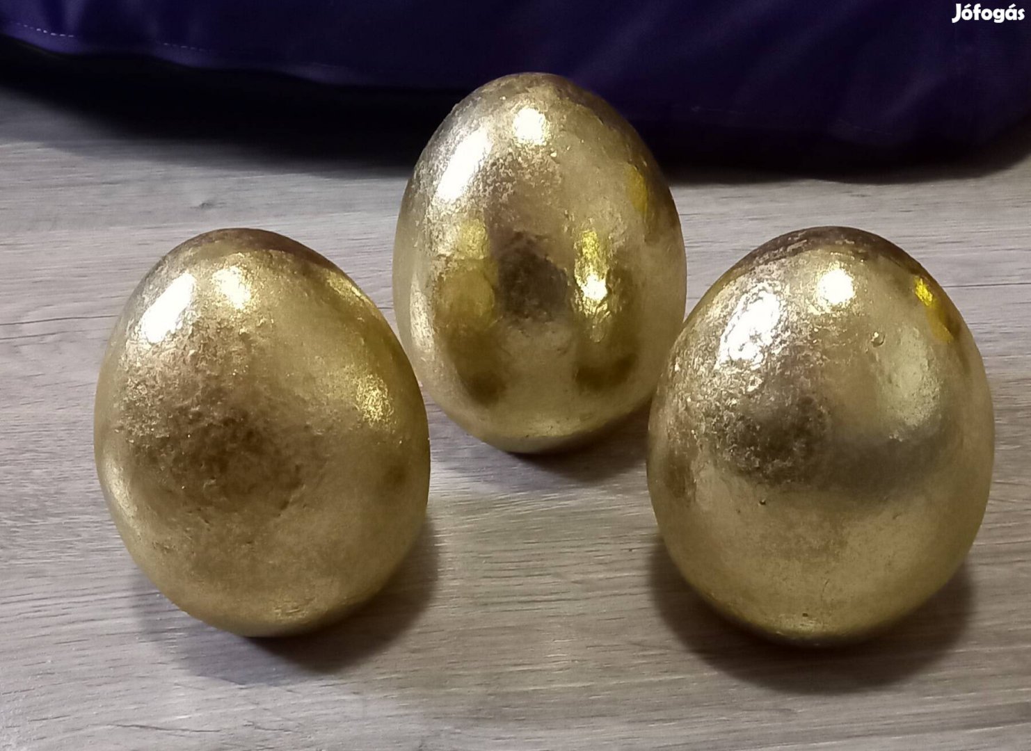 Egy fehér fonott kosár, 3 nagy kerámia tojás arany festéssel és 2 nyuszi, ami szövet, arany pöttyökkel és belül töltve van.