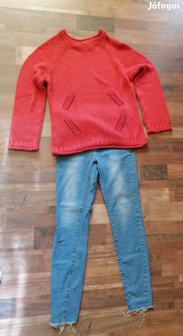 Párszor viselt hibátlan állapotú vastagabb kötött bordó pulcsi, szűkszárú alján gyárilag rojtos vékonyabb farmerrel.