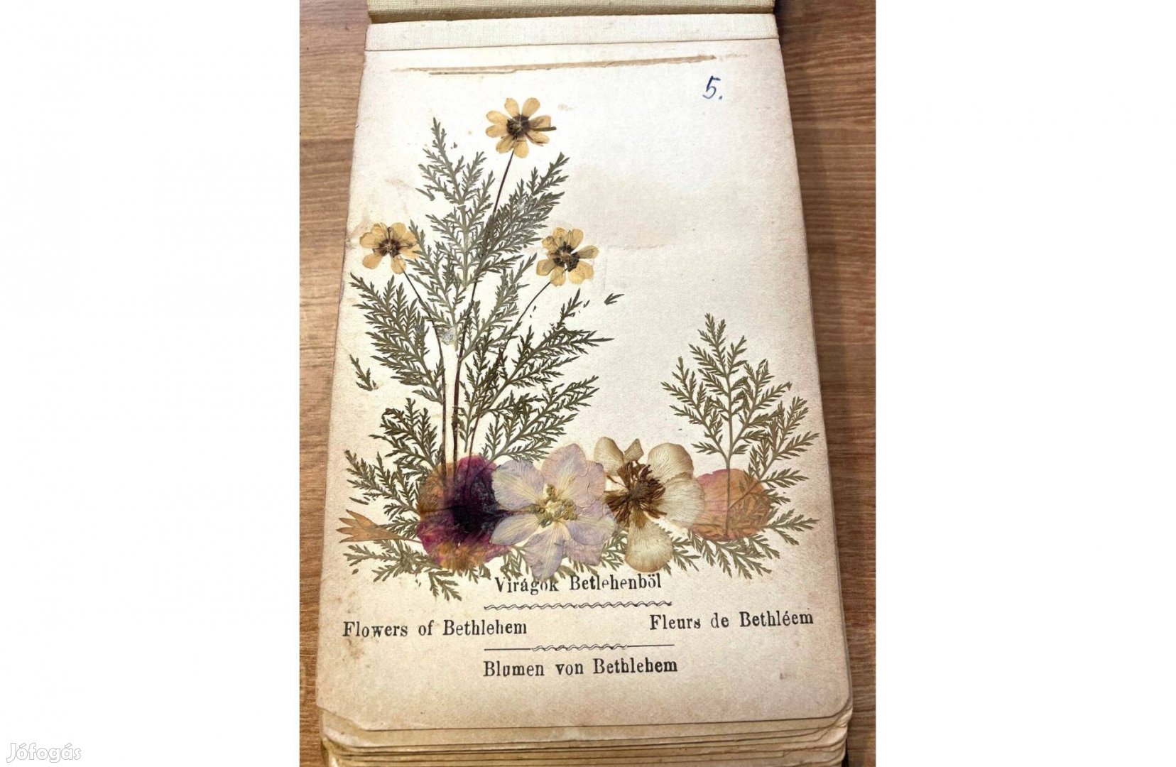 12 táblán bibliai helyszínekről (Jerusalem, Mont Zion, Mont Moriah, Siloah, Tomb Racher, Hebron, Mount Olives, Valley of Jordan, Flowers of Saron, Mount of Gerizim, Tiberias, Saffed) származó, eredeti, beragasztott préselt virágokat tartalmazó kötet, kb. az 1900-as évek elejéről.