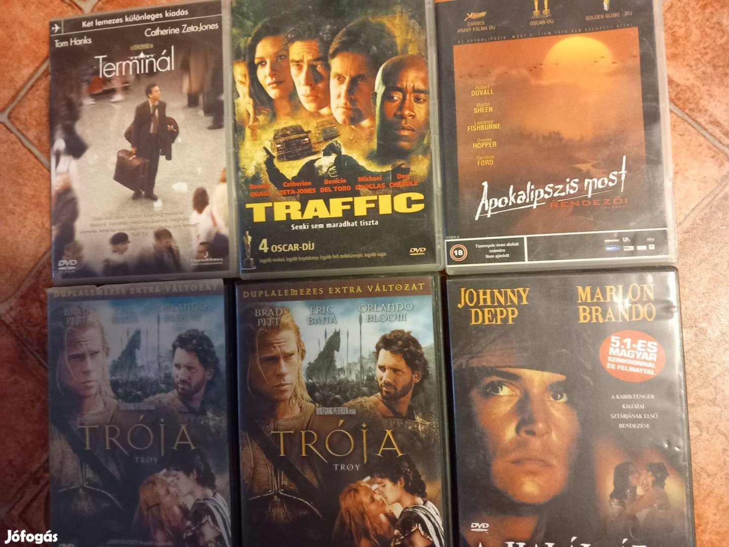 Terminál, Trafic, Trója, Apokalipszis, Johnny Depp eredeti DVD lemezek, ár db ár.