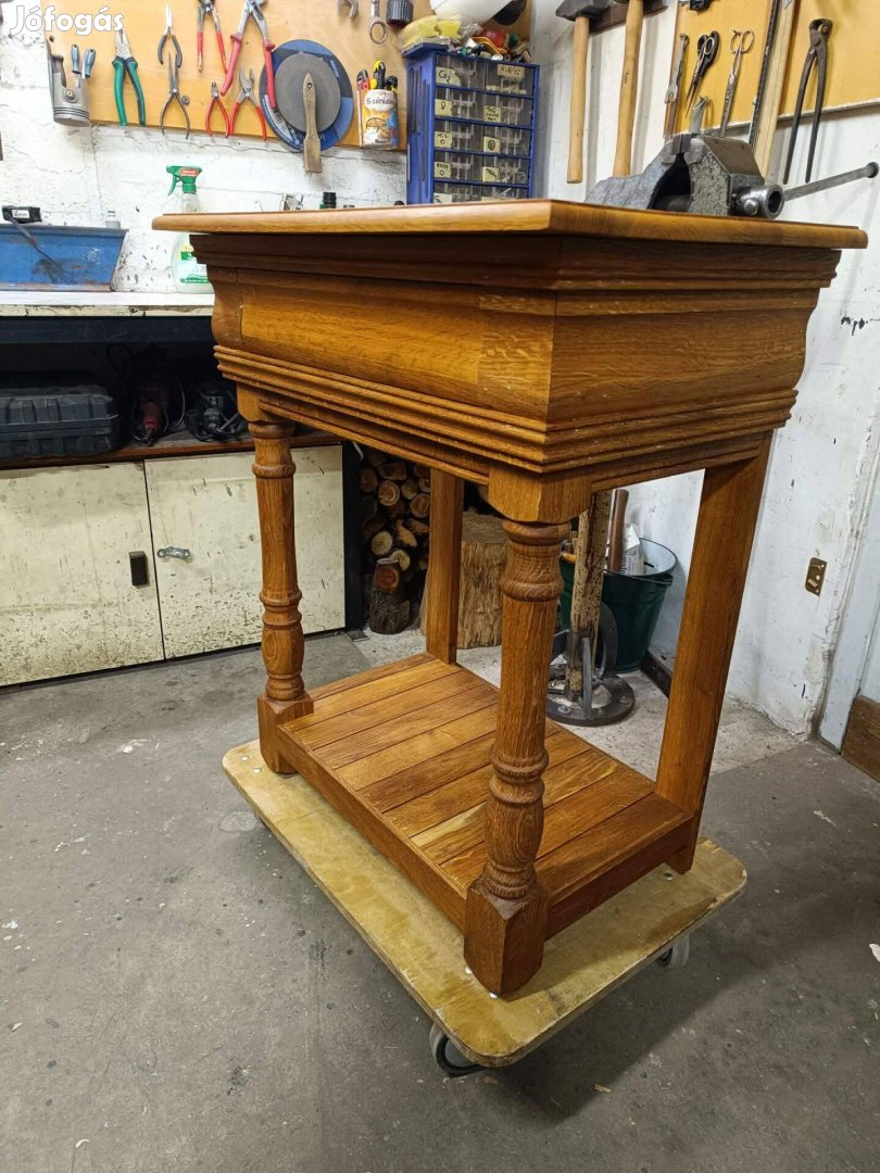 Eladó a képen látható tömör tölgyfa asztal 70cm széles, 43 cm mély, 82 cm magas.