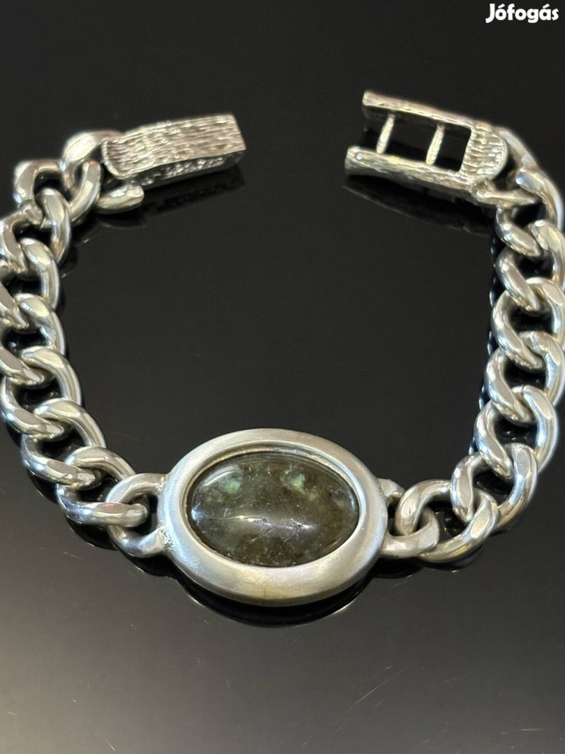 Eladó egy rendkívül komoly, hihetetlen masszív, látványos, gyönyörűen kidolgozott, antik,tömör ezüst karkötő, pompás, valódi-természetes labrador it kővel ékesítve. Szuper biztonságos, létrás biztonsági zárral.