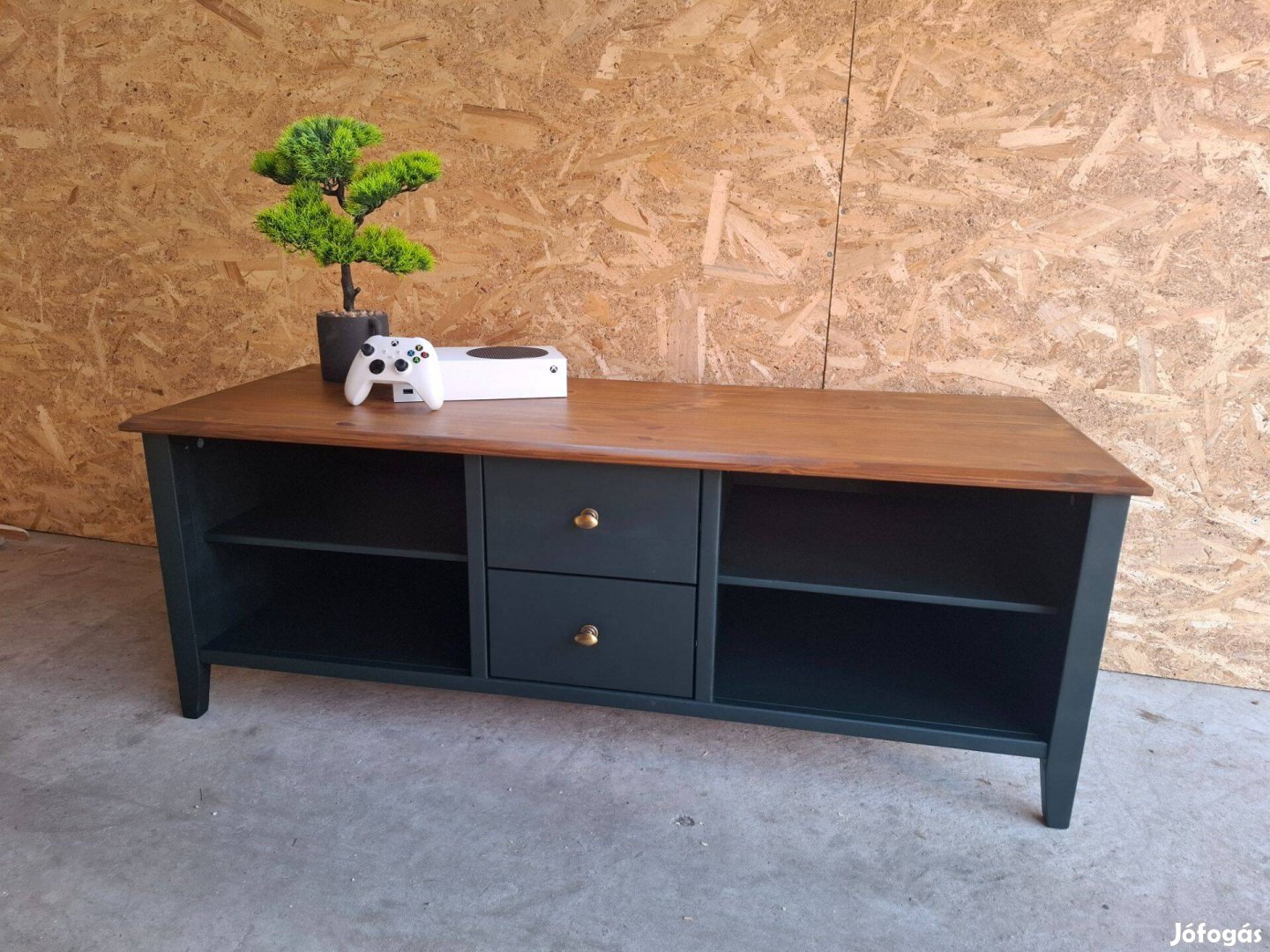 Eladó egy stílusos, felújított TV-konzol. A bútor tömör fenyőből készült: a váz egyedi matt erdőzöld színt kapott, a fedlapot pedig meghagytam eredeti fa mintázatában, dió színre pácolva és lakkozva a tartósság érdekében.