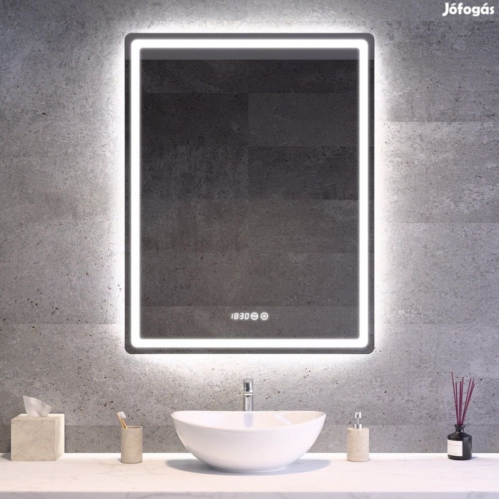Tükör LED világítással 70x90cm | Páramentesítő funkció | Beépített ór