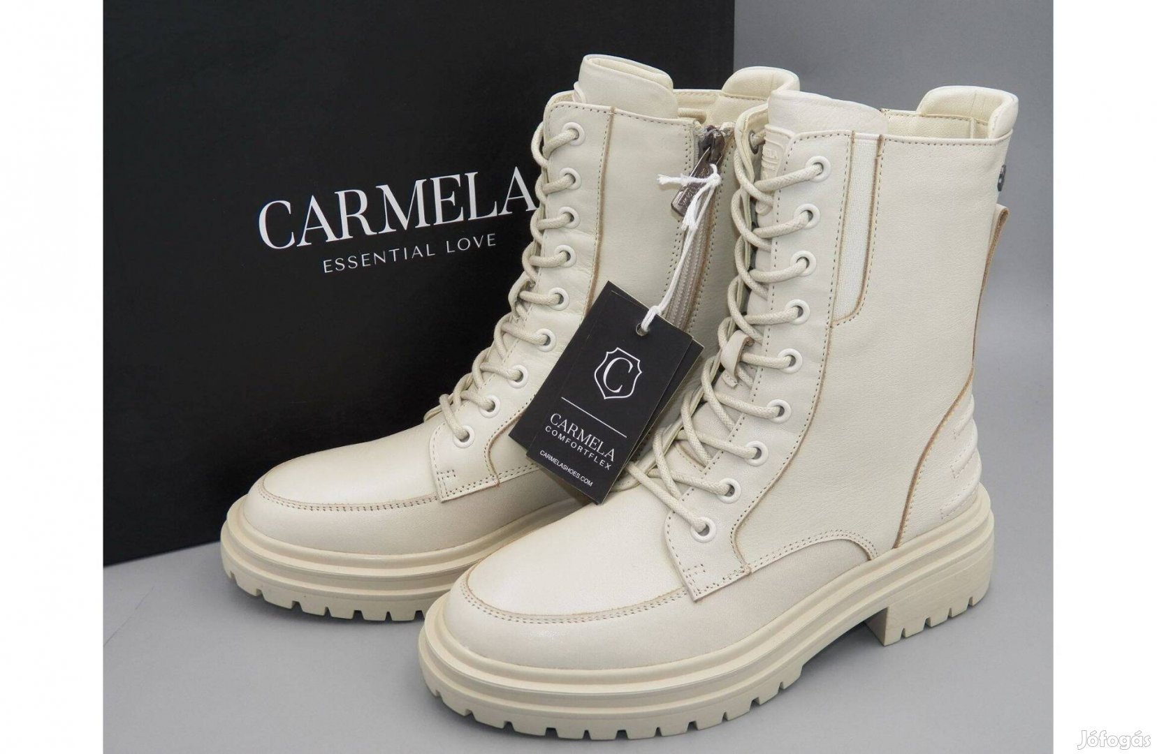 Vadonatúj Carmela valódi bőr spanyol bakancs saját dobozával. Felsőrésze és talpbélése valódi bőr, bélése vékonyabb textil anyag. Puha, párnázott ("memóriahabos" talpfelülete van. Vajszínű.