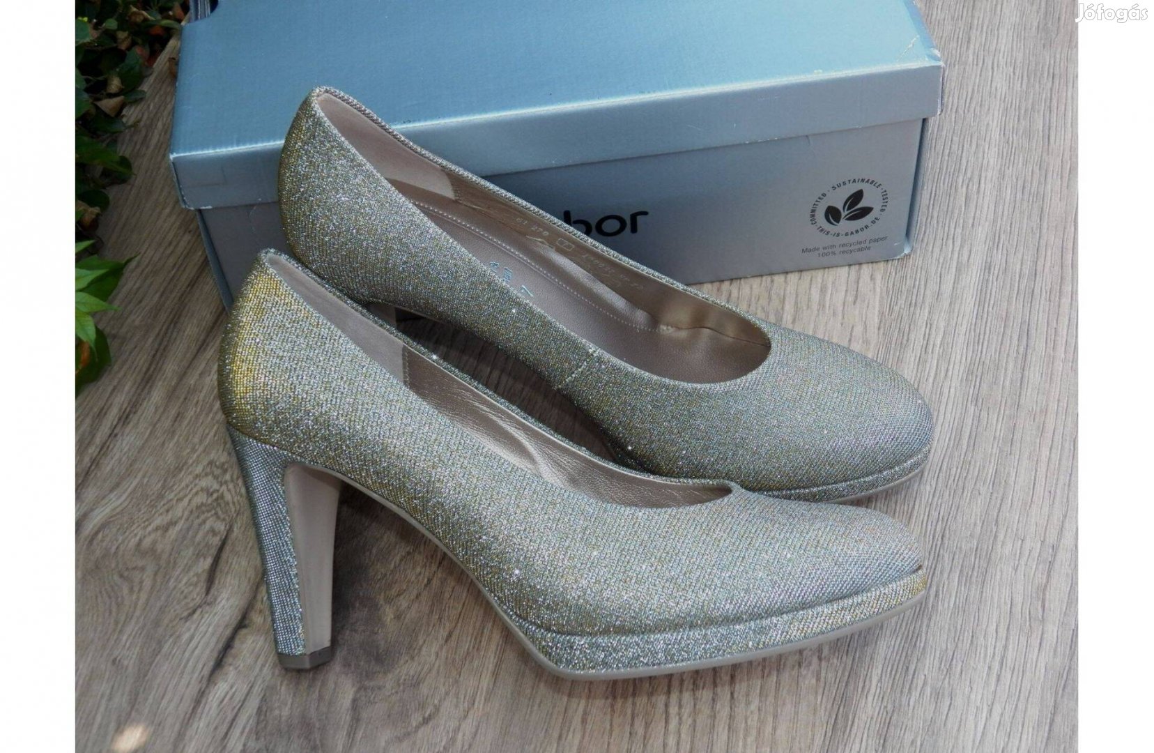 Vadonatúj Gabor Soft & Smart klasszikus fazonú magassarkú cipő saját dobozával. Külső része csillogó, pezsgő és arany színben játszó szövet anyag, talpbélése valódi bőr.