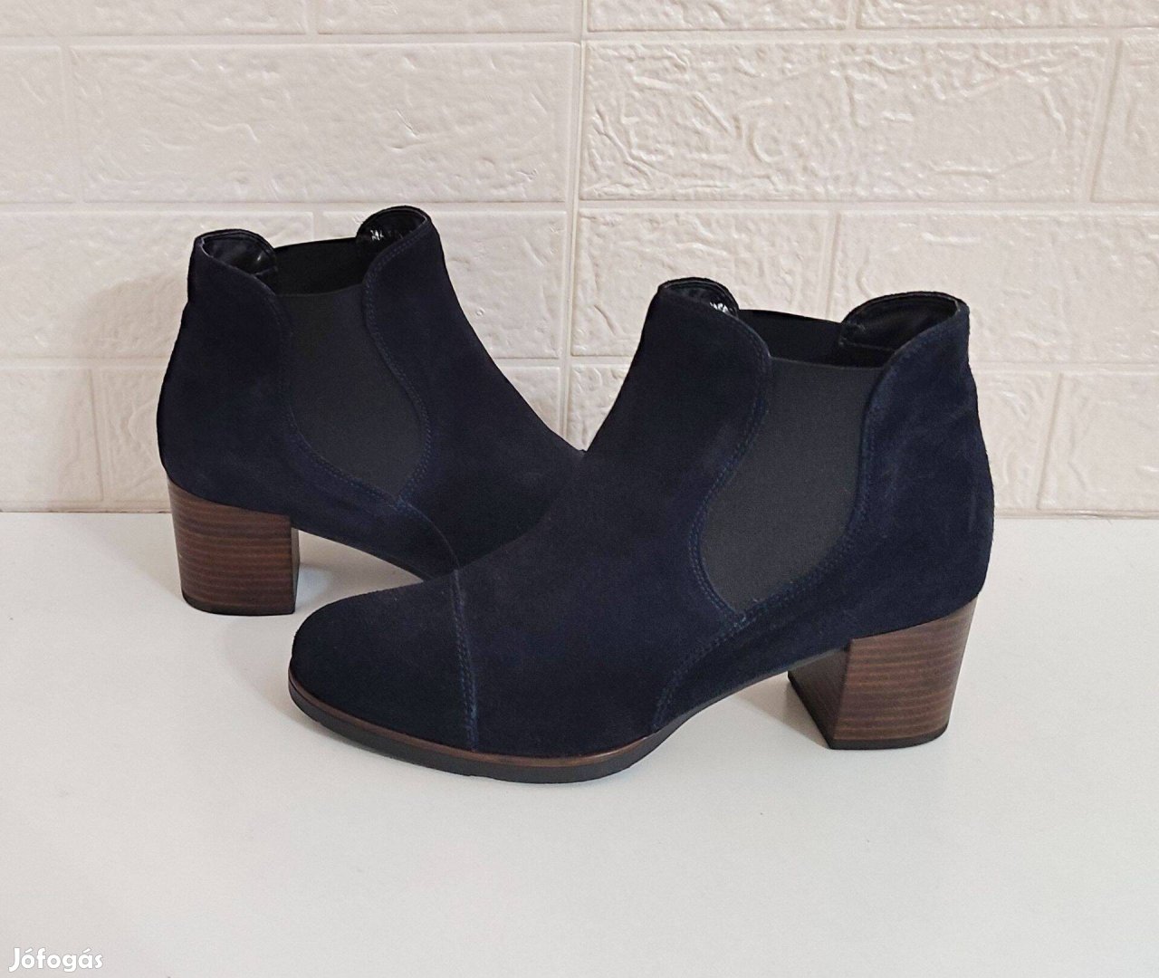 Új, kifogástalan, bolti állapotú, éjkék színű Fraiché bokacipő puha bőr felsőrésszel, sarokpárnás, bőr talpbéléssel, kényelmes sarokmagassággal (5 cm). A boka körül mindkét oldalán gumis, így nemcsak könnyű fel-és levenni, de vastag és vékony bokán egyaránt szépen áll.
