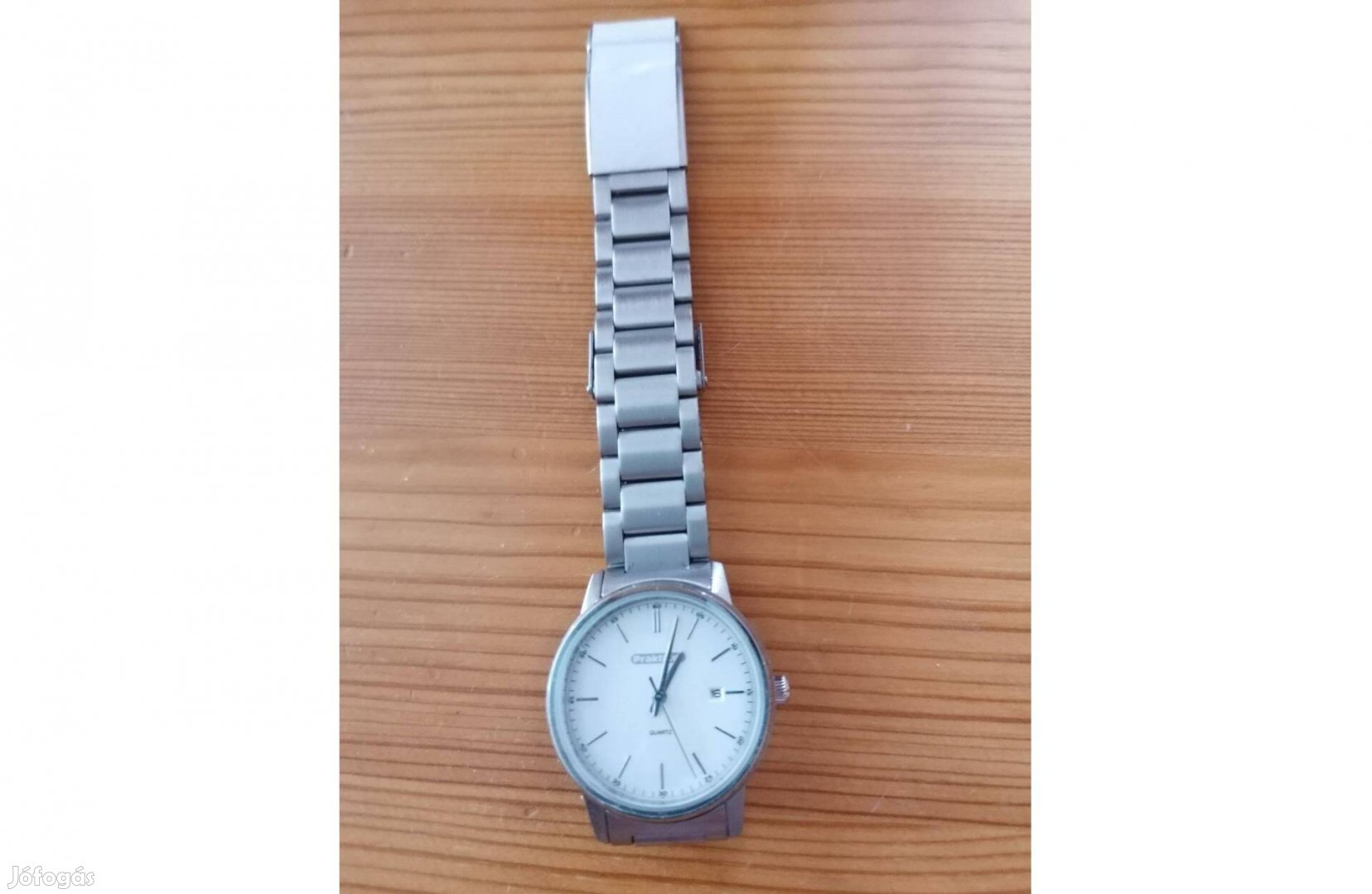 Új, ezüstszínű, cseppálló kvarc karóra.