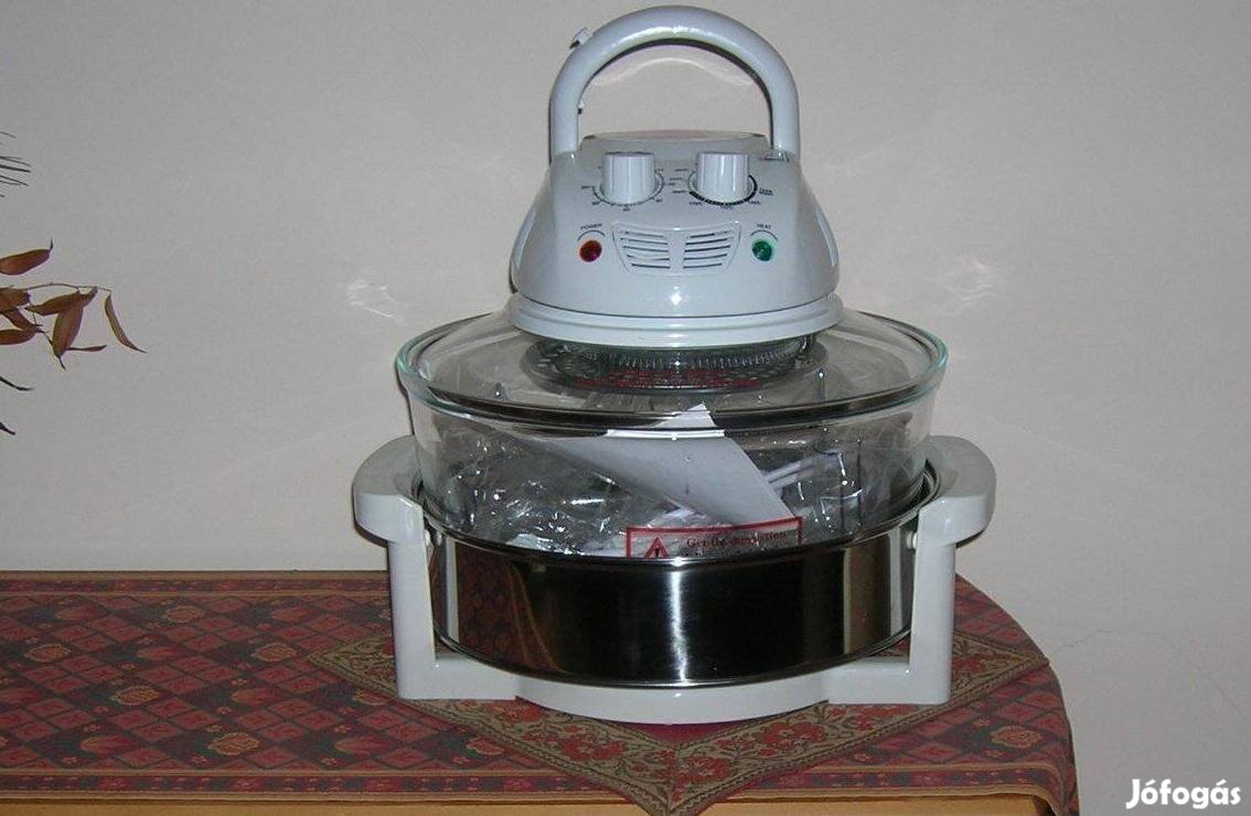 eladó új, légkeveréses edény,süt-főz-párol-kiolvaszt-grillez-pirít,sütemény is süthető benne,max.250 fok,12 literes 33 cm-s hőálló üvegtál,ami 6 literrel még növelhető,egyszerű kezelés,van útmutató füzet és doboza is,postázom is 1500.-ért