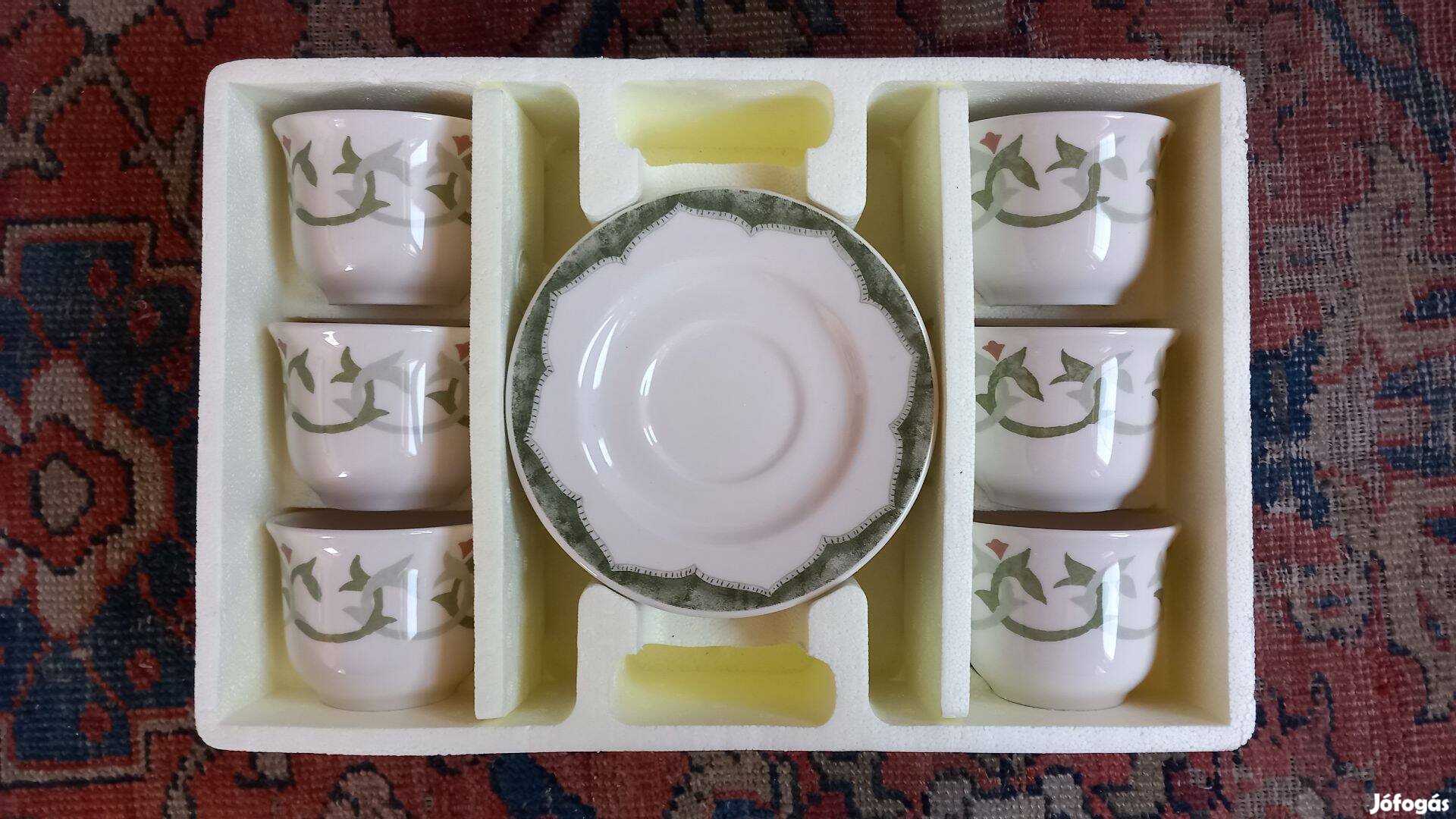Hat teás csésze és hat darab csészealj egy készletben. Zöld mintával díszítve. Teljesen új, nem használtuk.