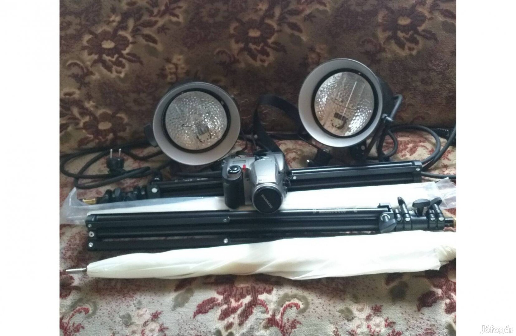 a Képen Látható Fotóstúdió Berendezés Külön- Külön Is Eladó. tartozékok 3 lábú Manfrotto olsz csúcsminőségű állvány. 4 részes, max. mag. 230 cm, rászerelhető lámpák, ernyő, fejcserével kamerával bővíthető. 2 db van ár 30000Ft/db. Lámpák olasz Brand márka, átmérője 17 cm, állandó fényes kapcsoló. 2 dv van. Ár 2500 Ft/db. Ernyő fehér színű , átmérője 104 cm. 2 db van, Ár 3000/ db, és 1 db Olympus 14OO XL típusú, Brige modell, japán digitális fényképezőgép Ár 10000,- Ft.