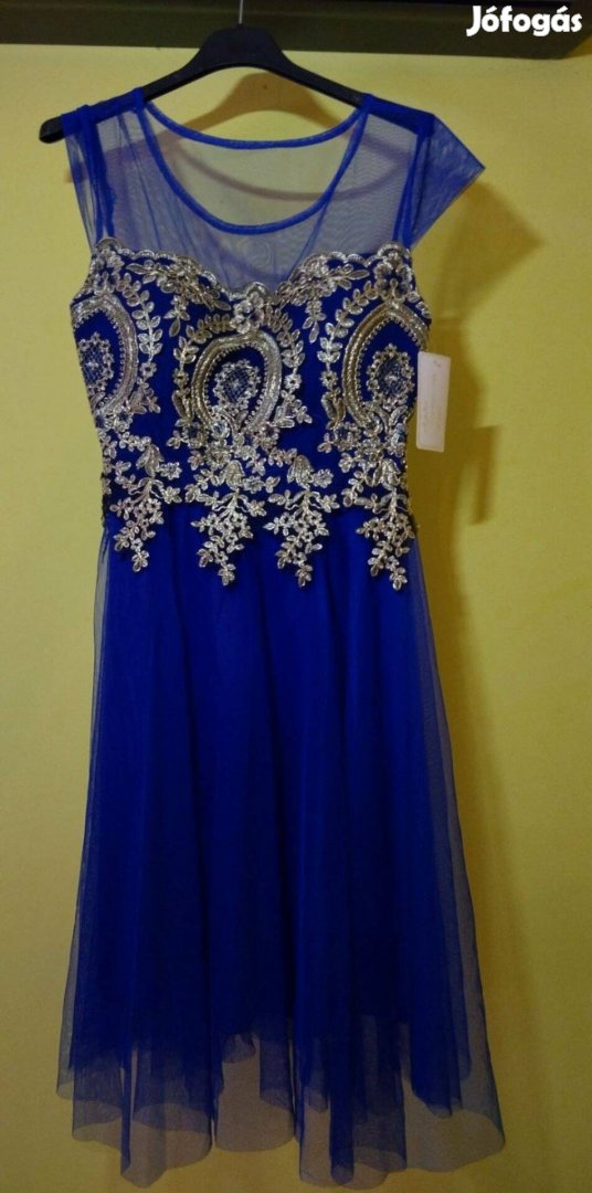 Vadonatúj, olasz, álomszép kék-arany, tüllszoknyás, rátétes alkalmi ruha, van alá varrva egy sötétkék anyag, hogy a szoknya rész ne legyen átlátszó, hátul gumis