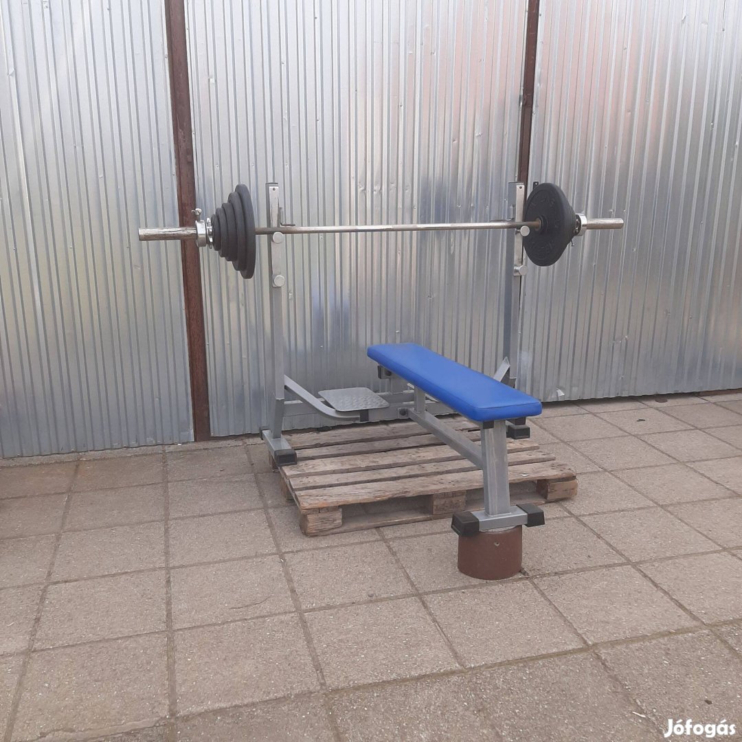 Kiváló állapotban lévő edzőtermi Vasil fekpad, atlas 50mm-es 20kg olimpiai rúd, verseny szorítókkal, 2x15kg, 2x10kg, 2x5kg, 2x2,5kg, 2x1,25kg gumis súlytárcsa.