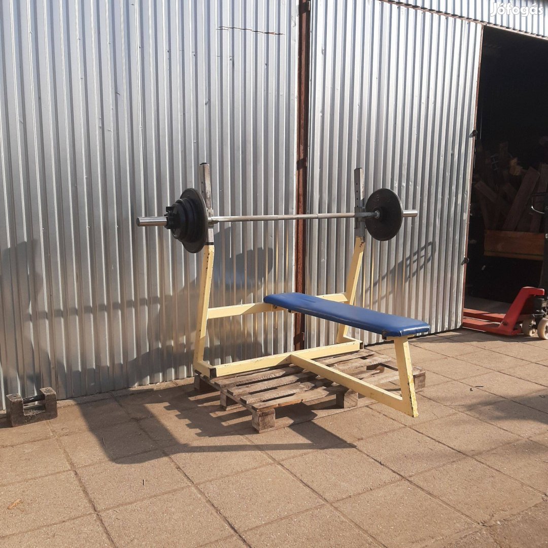 Masszív edzőtermi, vasil powerline Jlm edzőtermi fekvenyomó pad, 20kg 50mm-es rúd szorítókkal, 2x15kg, 2x10kg, 2x5kg, 2x2,5kg gumis és fém súlytárcsa eladó! A pad szétszerelhető, szállítható.
