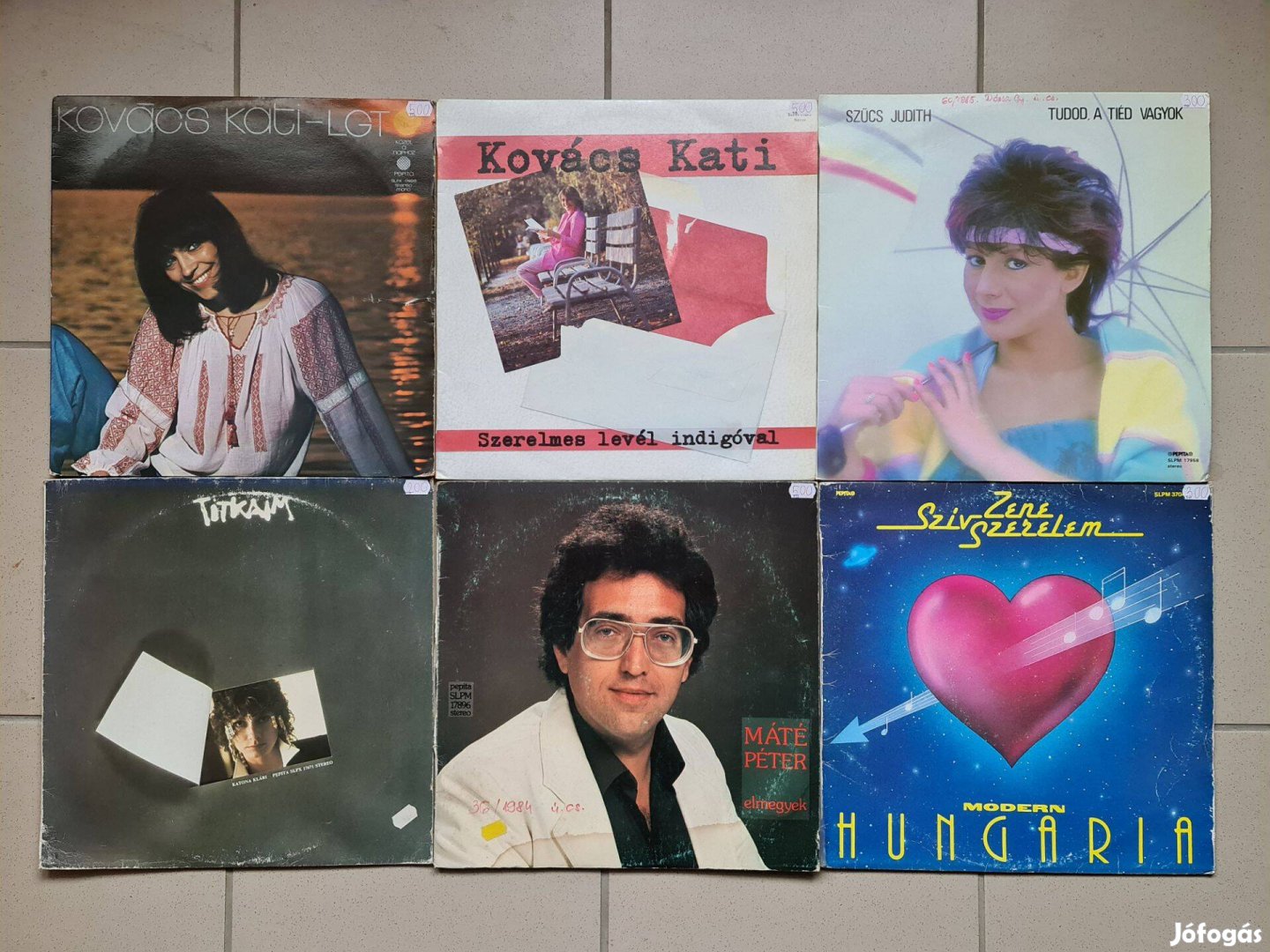 Az utolsó képen bal oldalon alul 7 db egyforma le nem játszott lemez, jobb oldalon 7 db vegyes lemez látható.