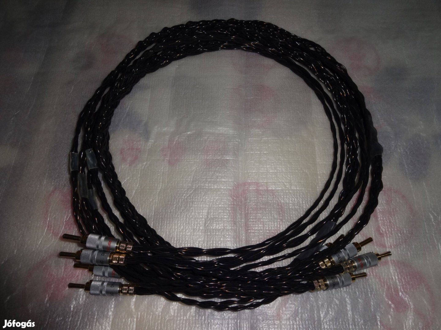 W Enterprises Northwest Music "Timbre" GOLD 2 x 2 m hangfalkábel eladó. 12 x tömör vezető ér arany ezüst réz speciális ötvözete teflon szigeteléssel és a rádió frekvenciás zavarok elleni fonattal, DH Labs ékzáras banándugókkal szerelt. Mindkettőn eredeti márkanév felirat sorszámozott és irányjelöléssel, merev kábel de könnyen hajlítható elhelyezhető, Amerikai gyártmány.
