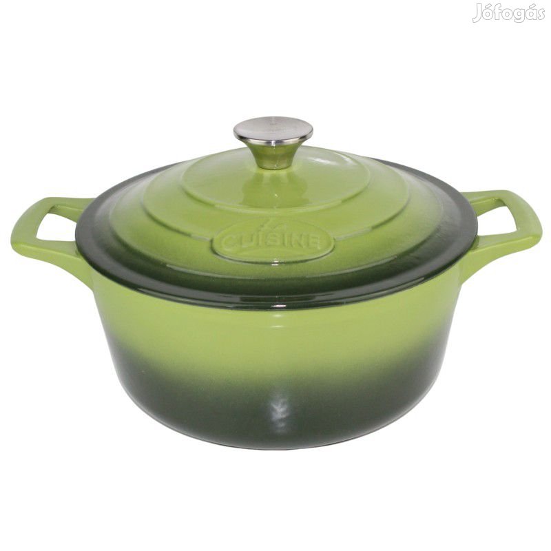 26 cm széles, 12 cm magas minőségi zománcozott öntöttvas lábas fedővel zöld színben, 4,75 literes űrtartalommal. La Cuisine GREEN
