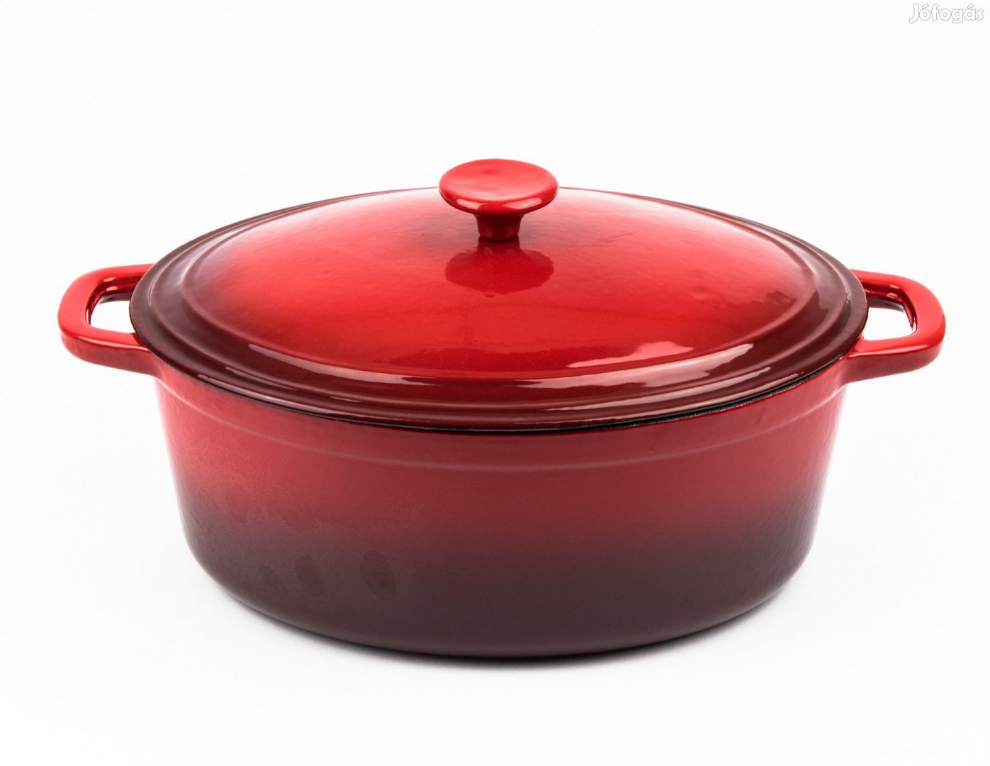Piros zománcos öntöttvas kacsasütő tál fedővel, 25 cm széles, 33 cm hosszú (külső méret), 13 cm magas, fedővel 19,5 cm magas, 40,5 cm teljes hossz füleknél mérve, 6,5 literes űrtartalommal.