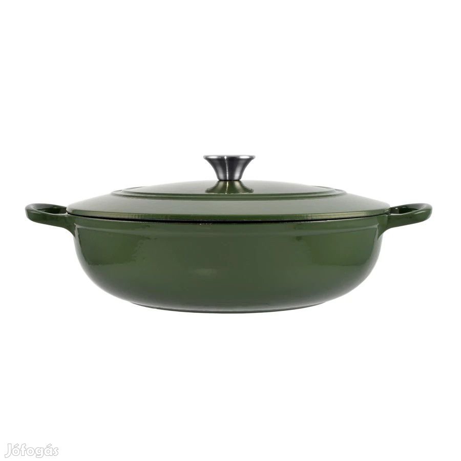 Zománcozott öntöttvas szeletsütő olívazöld, fedővel, tört fehér belső zománccal.