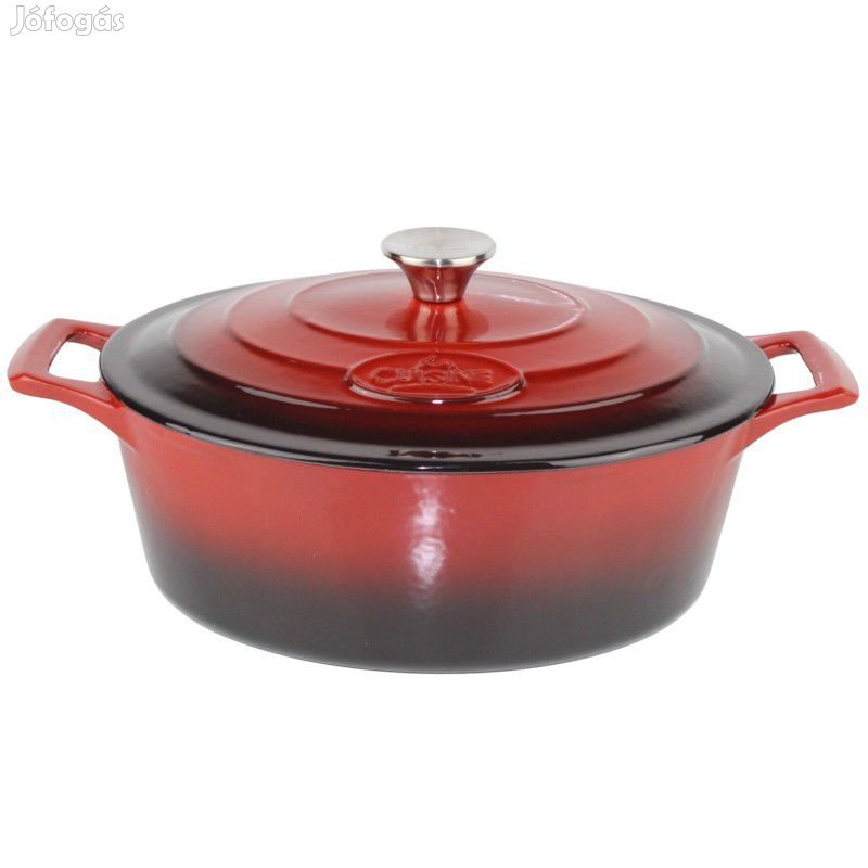 Minőségi 4,75 literes űrtartalmú ovális öntöttvas sütőtál piros színben, kb 29 cm hosszú, 23 cm széles és 11 cm magas fedő nélkül.