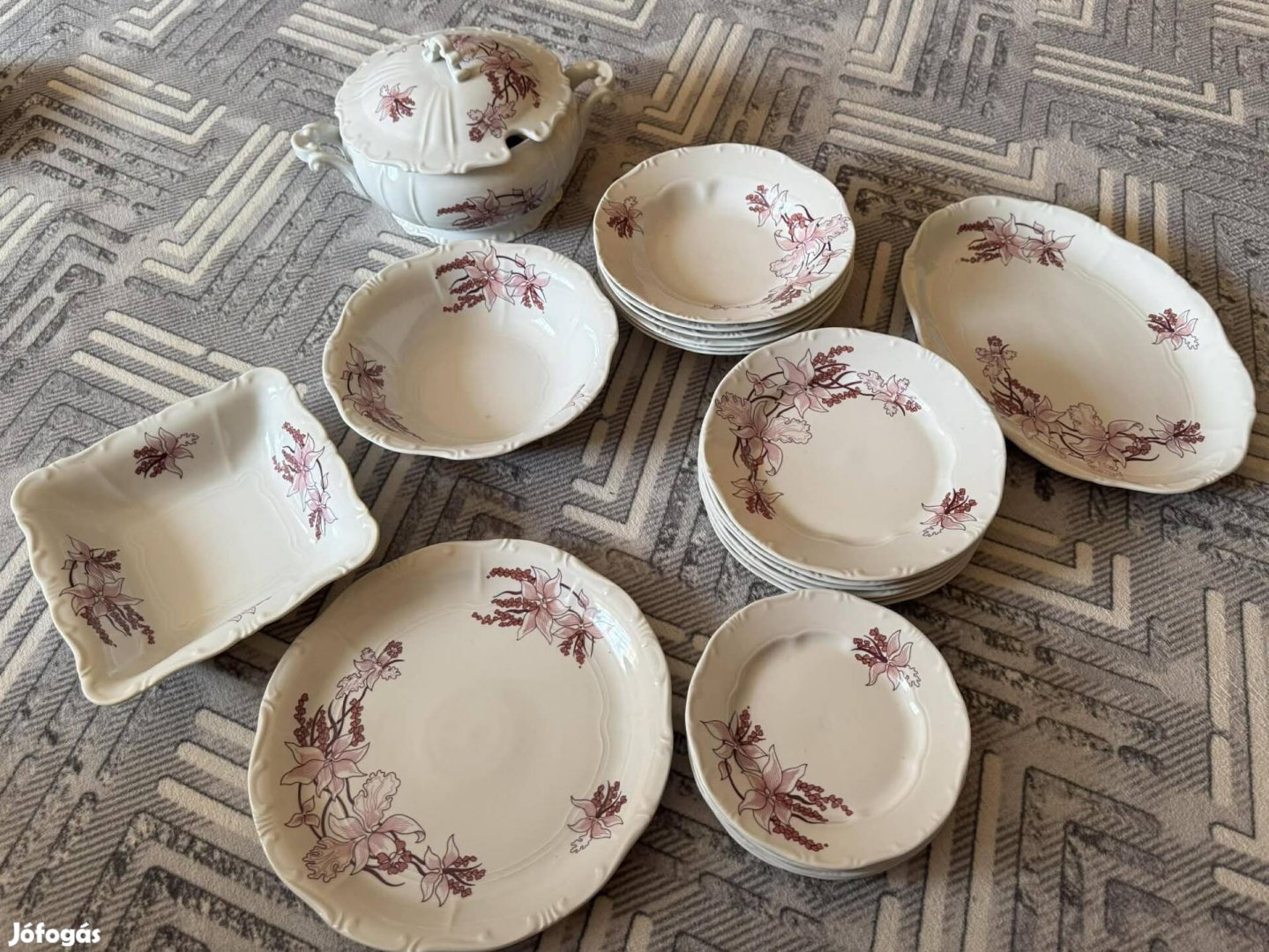 Eladó szép 23 darabos Zsolnay porcelán étkészlet! Narancs export backstamp "Zsolnay Hungary Pecs" + EST 1853, kék [2]-es jelzéssel (1980-90-es évek export darab). Állapot: Nagyon jó, chip-mentes, repedés nélküli, élénk színek. Csak minimális súrlódás a tányérok alján (normál használati nyom, nem látható.nem használt!