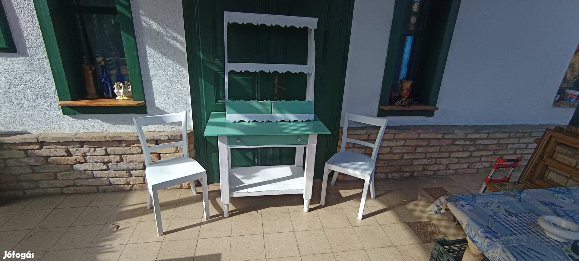 Eladó régi, felújított asztal két székkel polcal. Asztal méretei: 96*55 mag.: 80 cm