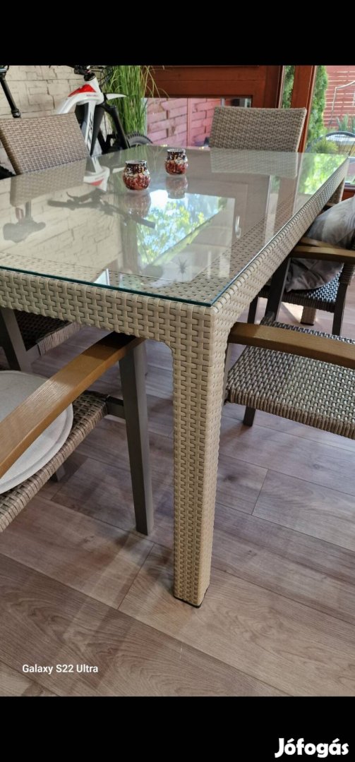 Rattan hatású étkező asztal üveg lappal 6db székkel.