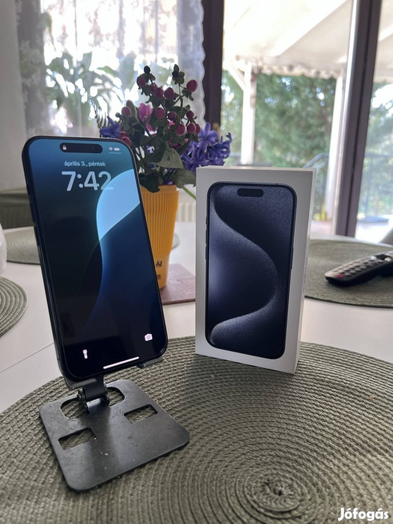 Eladó iphone 15 Pro E-SIM, sötétkék színben, 128 GB-os kivitelben új készülék vásárlása miatt.