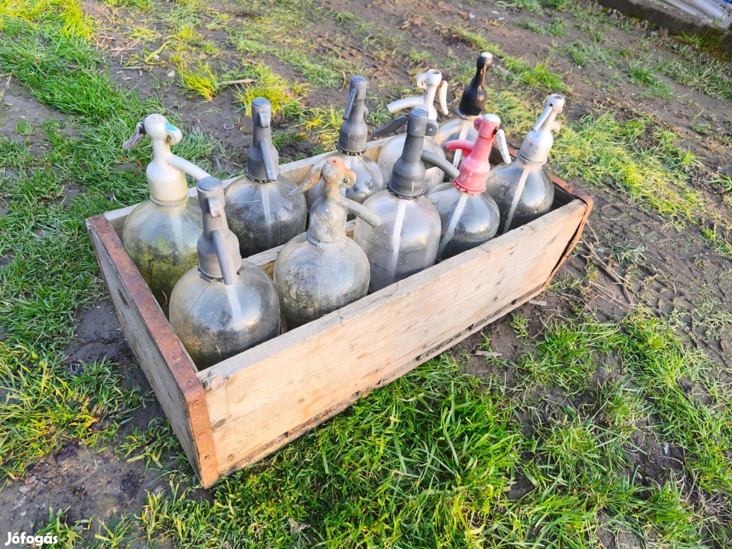 10 db . szódásüveg , eredeti fa ládában