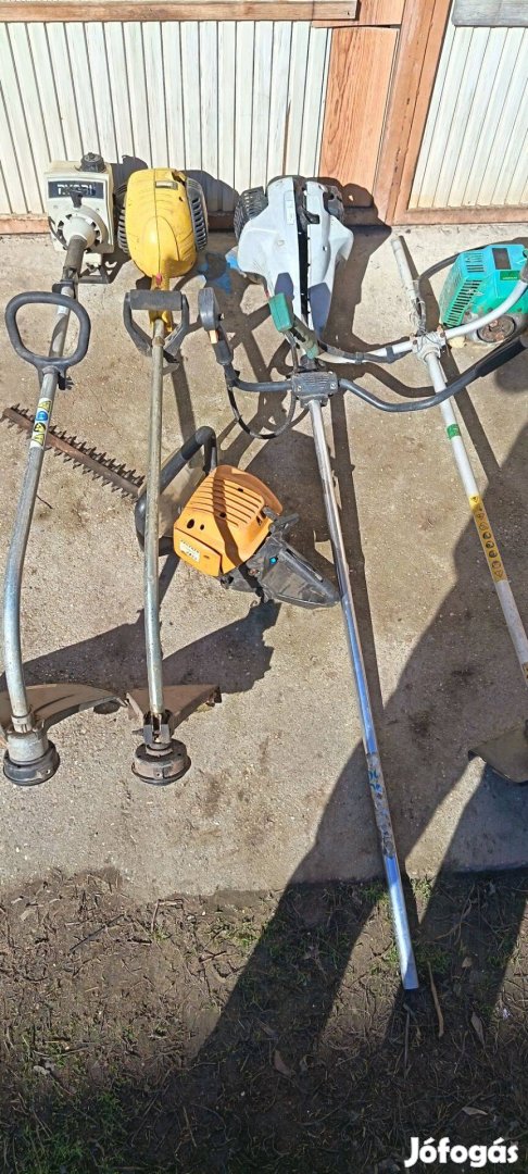 Eladó a képeken látható fűkaszák, és egy sövényvégó, mindegyikben van kompresszió, főként hajtás probléma van a kettő nagyobbik kaszával, beöntésre mindegyik felpörög, karburátorok átnézésre, tisztításra szorul. Tankok nem lukasak, kicsi kaszák hiánytalanok. Sövényvágó elindul, de nincs alapjárat. Egyben szeretném eladni, posta megoldható