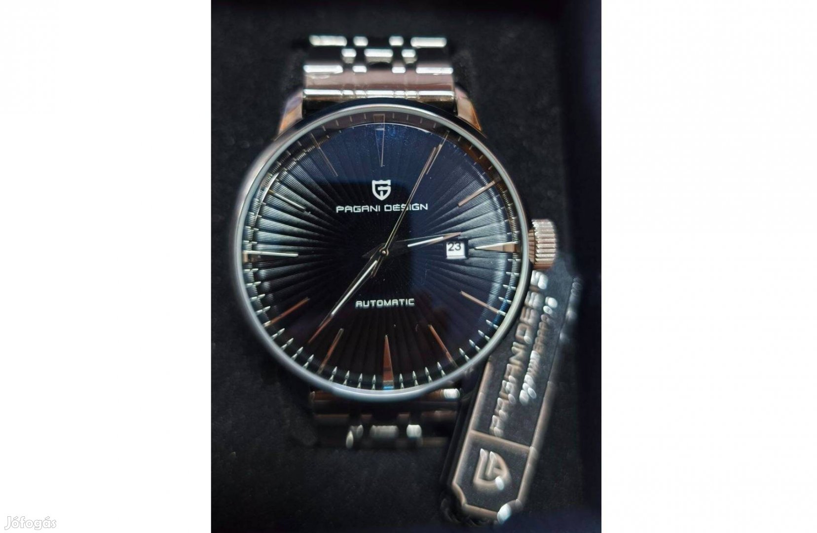 Gyönyörű fekete számlap, 42mm-es tok, acél szíj.