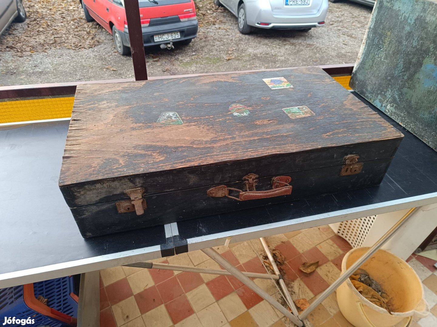 Eredeti állapotban, kulcsa nincs meg, a zár nehézkes, bőr fogantyúval. Mérete: 75*41*16 cm (szél * hossz * mag). Kérdésre szívesen válaszolok, nézd meg a többi hirdetésemet is!