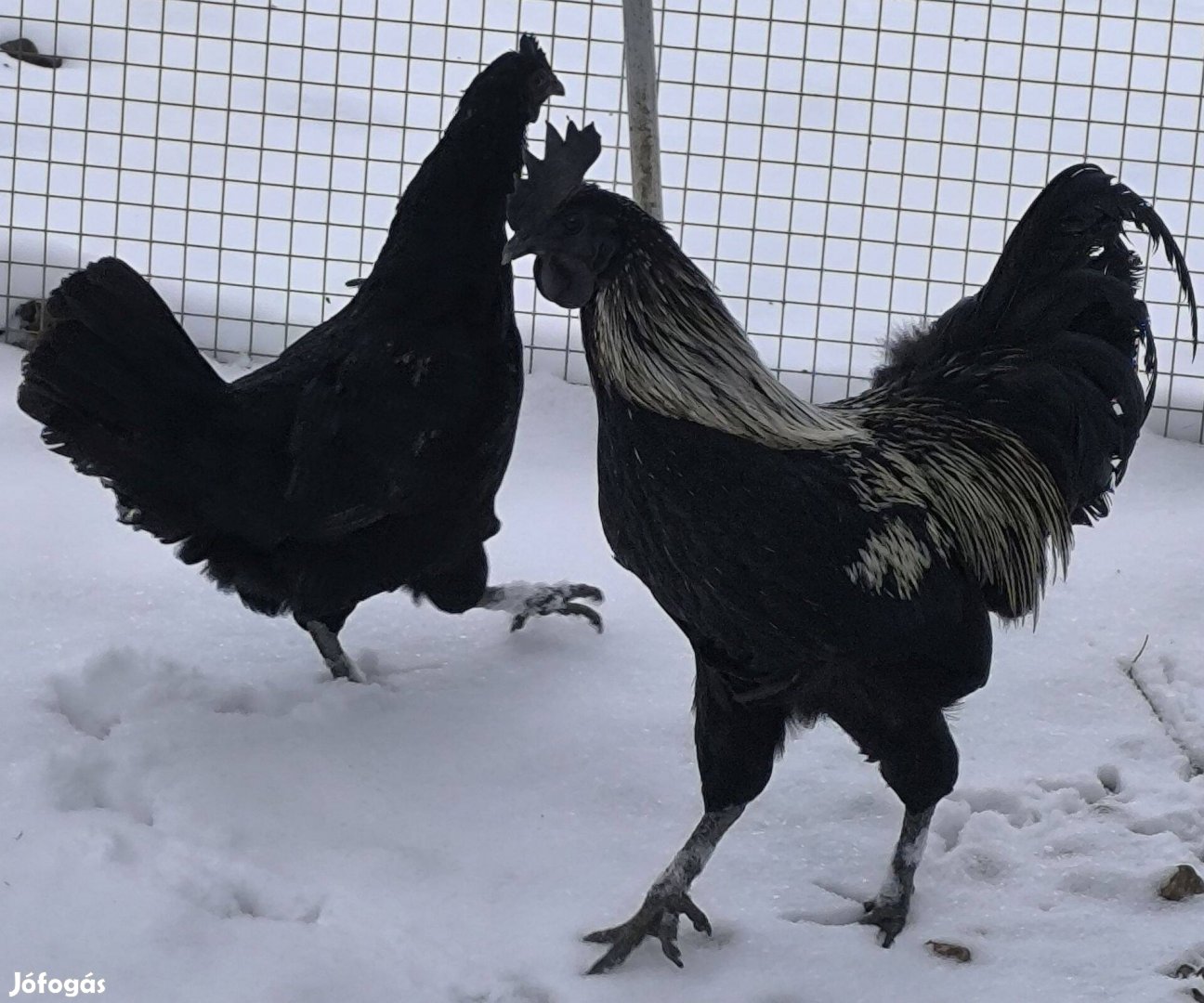 Tavalyi Ayam cemani kakas, fehér színhibák miatt kilós áron elvihető. Taréja, lába ugyanolyan fekete, mint teljesen fekete tollazatú társainak. Ezzel a színnel látványosabb, mint a fekete kakasok, de fajtatiszta tenyésztésre nem alkalmas.