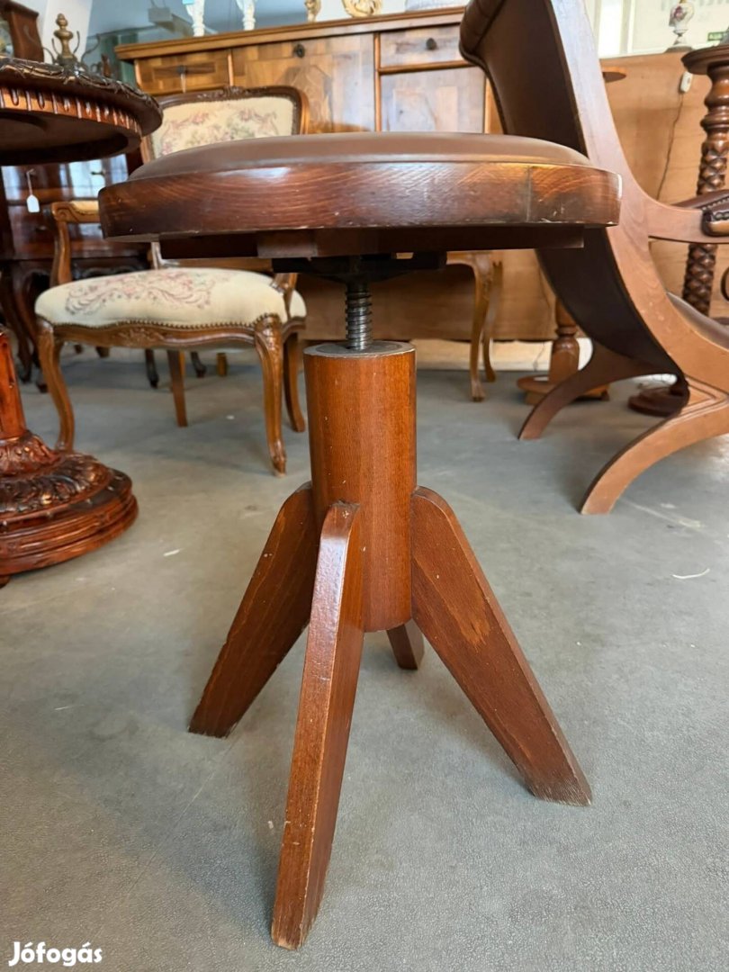 Elegáns, klasszikus stílusú zongoraszék bőr ülőfelülettel és masszív fa szerkezettel.