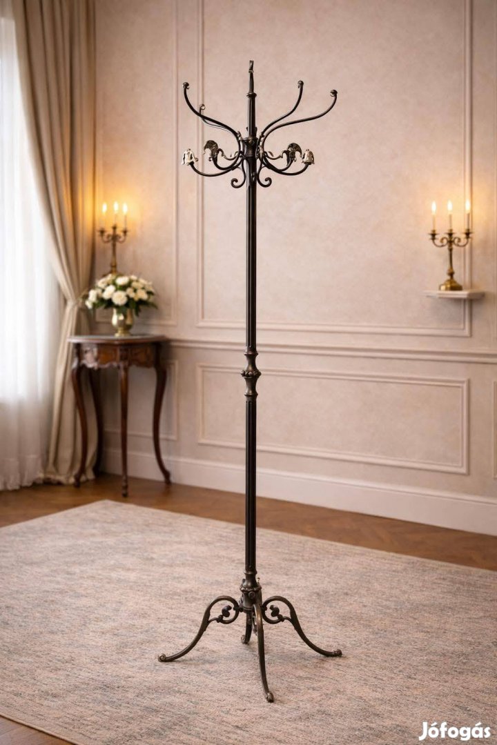 Különleges, klasszikus megjelenésű bronz állófogas, gazdagon díszített akasztókkal és elegáns, stabil talppal. Időtálló és dekoratív darab, amely nemcsak praktikus, hanem látványos kiegészítője lehet egy előszobának, szalonnak vagy üzlethelyiségnek.