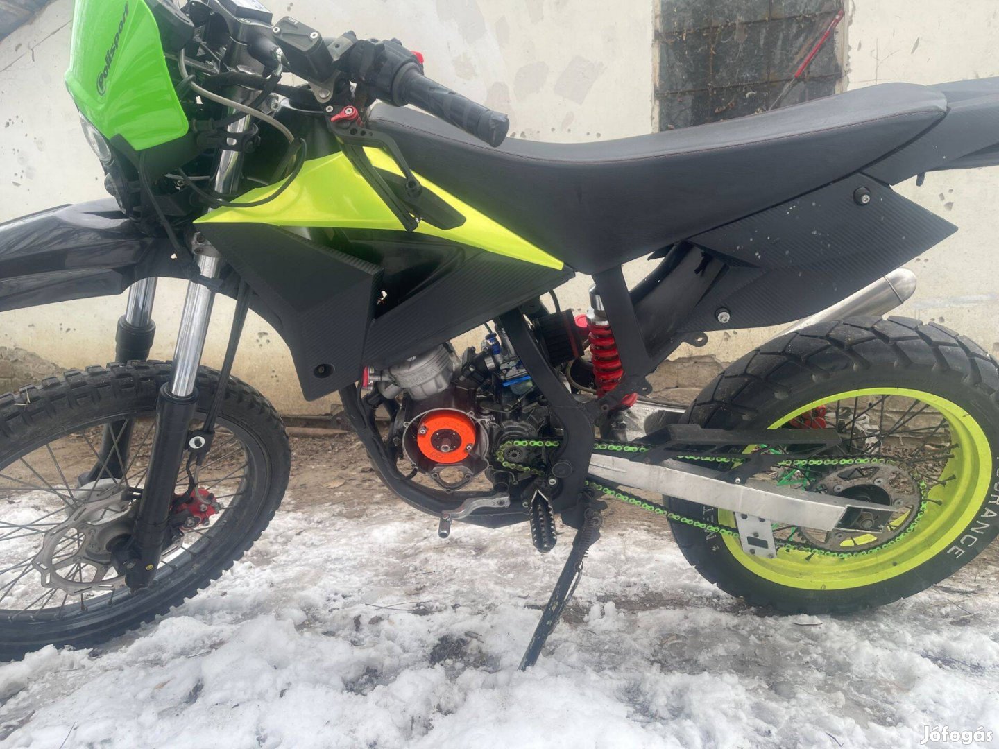 Kb egy éve nem használom csak áll. A hengerben kb 200km van ahogy a tengelyben is. Athena power 50 új jasil hajtókar egy voca hpc tengelyen. Szénszálmembrán 28 as karbi voca direktszűrő mvt rotor mart torok top szívócsonk új voca lánc adelin karok hidro kluplunk kiemelő polisport fej új gyorsgázkar új c4 műanyag kosaras csapágy a tengelyen és új csapágyak a váltóban. Jár hozzá egy szett kerék, most felemásan van fent a gumi miatt de egyébként supermoto szett és cross szett.A henger doboza és a gyújtás doboza is megvan. Az ülés újra van húzva az idomok fóliázva. A kipu nem a legjobb de elmegy. Át kell nézni be kell állítani de ennyiért a hülyének is megéri.A motor sok része át van alakítva tehát a gyáritól erősen eltér! Én beleuntam úgy hogy Ha kell egy jó vétel hívj.