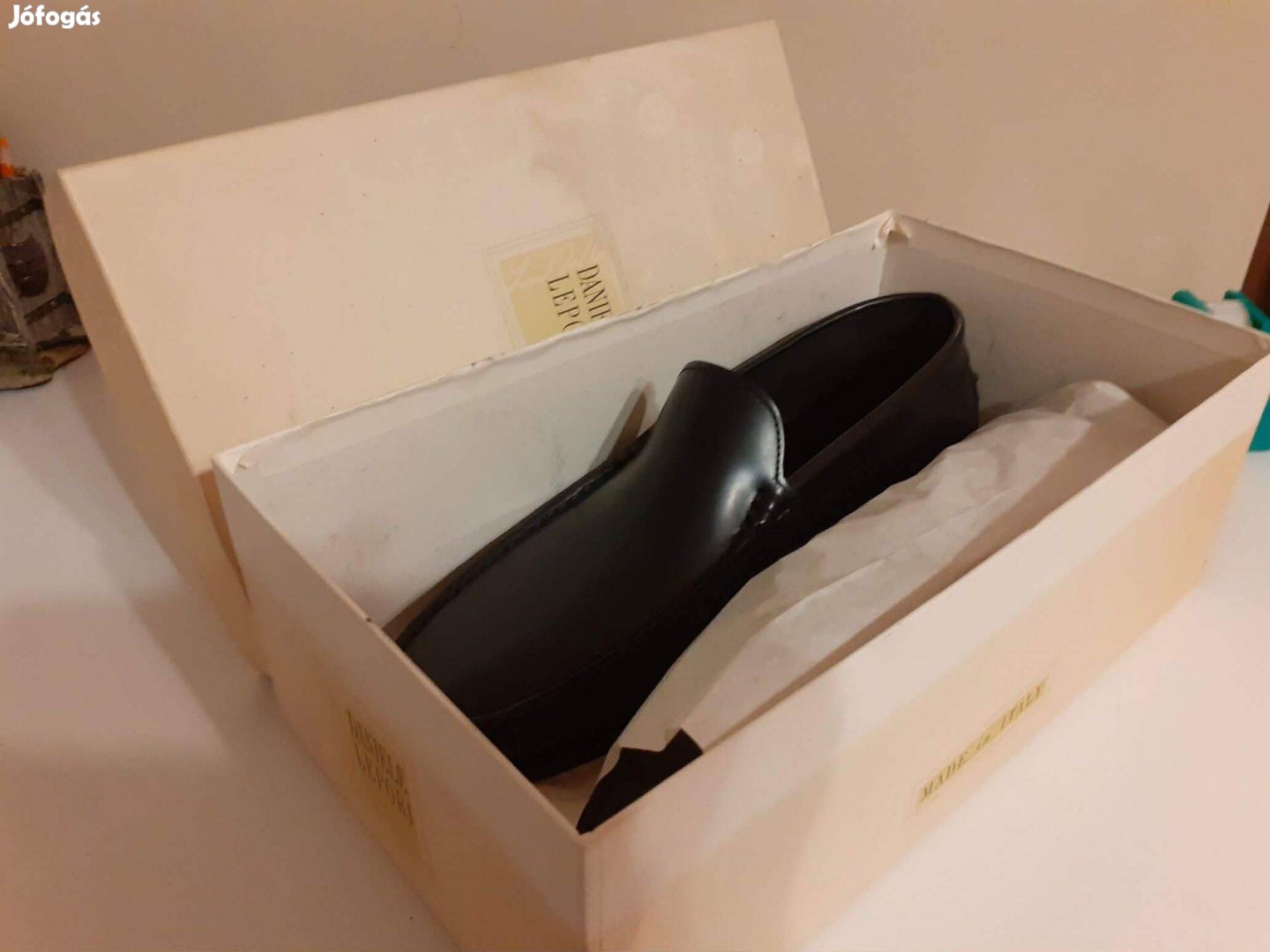 Új termék, eredeti dobozában. Használva nem volt. Daniele Lepori (Olaszország, Toszkána) által készített, kézzel varrot bőr cipő, bőr varrot talppal. A talpon és a cipő sarki oldalán csúszásgátló gumigyöngyök.