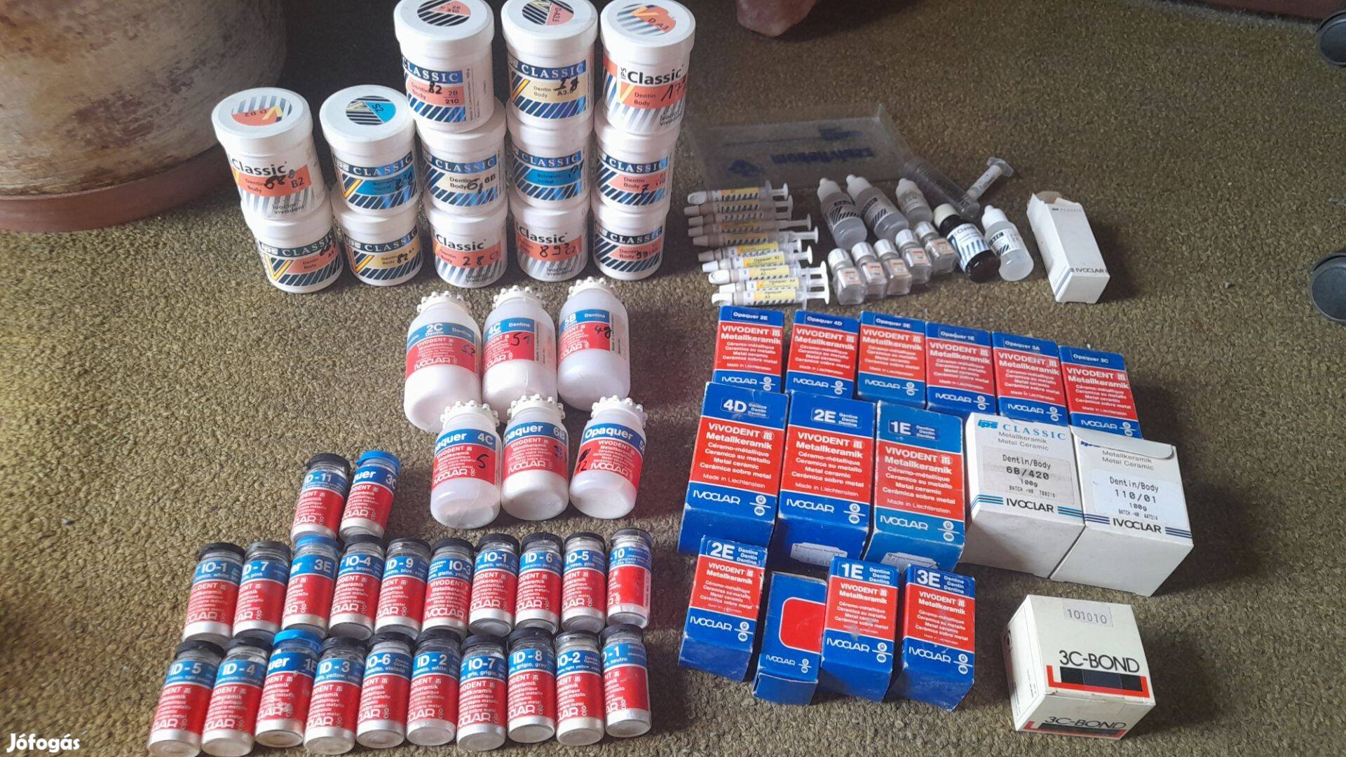 különböző típusú különböző súlyú, együtt kb 1800 gramm dentinpor és 10 darab IPS Classic Opaquer 3 G+3 Darab Ivoclar Glasurpaste+ 3c bond kew