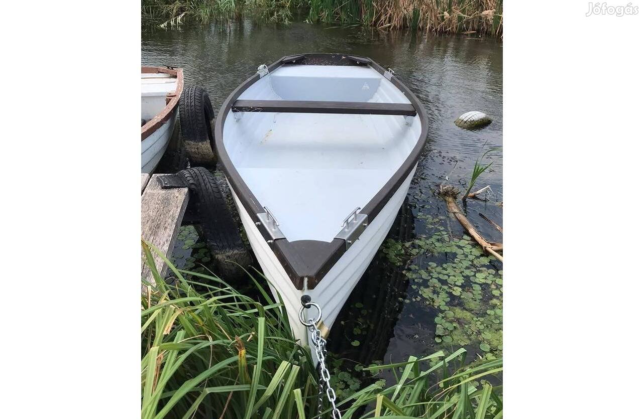 Eladó a képen látható újszerű, sérülésmentes, üvegszálas, 4 méter hosszú és 1,35 méter széles balatoni csónak. Rozsdamentes kikötőbikákkal, erősített kivitelben.